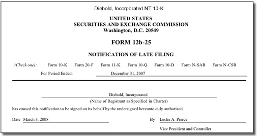 By MarketWatch (10 Mar 2008)Diebold filed a disclosure document with the SEC on March 3, describing the resolution of an ongoing SEC investigation and the potential restatement of earnings.