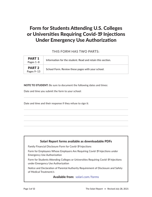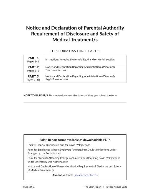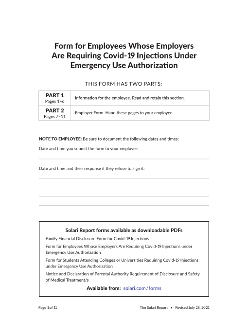 The following forms are provided to help families, employees, students, and parents successfully implement complete due diligence and informed consent with respect to COVID-19 injections. We are currently reviewing possible updates based on President Biden’s announcement of federal mandates. We are waiting for the actual federal position and directions to employers to be published by the Department of Labor. We continue to follow legal positions from Governors and State Attorneys General who will take the position that such mandates are not legal or enforceable in their states. Please make sure you investigate the specific legal treatment and enforcement practices within your particular state and local jurisdictions regarding mandates and exemptions.
