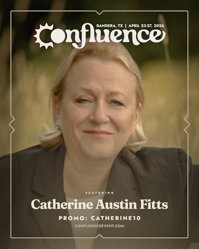 | Confluence 2026, April 23–27, 2026 Bandera, Texas | Join us April 23-26th, 2026 Confluence is an annual festival in celebration of health, freedom, and coherence, where a heart-based health and freedom community comes together to learn, connect, and build the future our hearts know is possible. Held on Sovereignty Ranch, a 200-acre regenerative farm just outside of San Antonio in Bandera, Texas, Confluence blends the best elements of a traditional conference, a farmer’s market, a wellness retreat, and a music festival into one immersive, community-centered experience. Catherine Austin Fitts is guest speaker the evening of April 26th, 2026 Purchase Tickets HERE. Get 10% off with code CATHERINE10. |