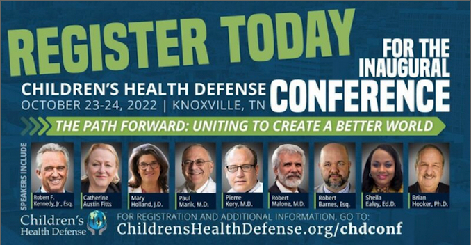 | October 23-24, 2022 The Inaugural Children’s Health Defense Conference ![]() | The Path Forward: Uniting to Create a Better World Information and registration HERE |