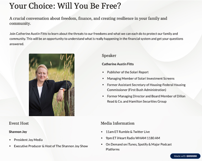 | October 5, 2022 Catherine Austin Fitts on O’Meara & Borjesson ![]() | Listen to Audio HERE |